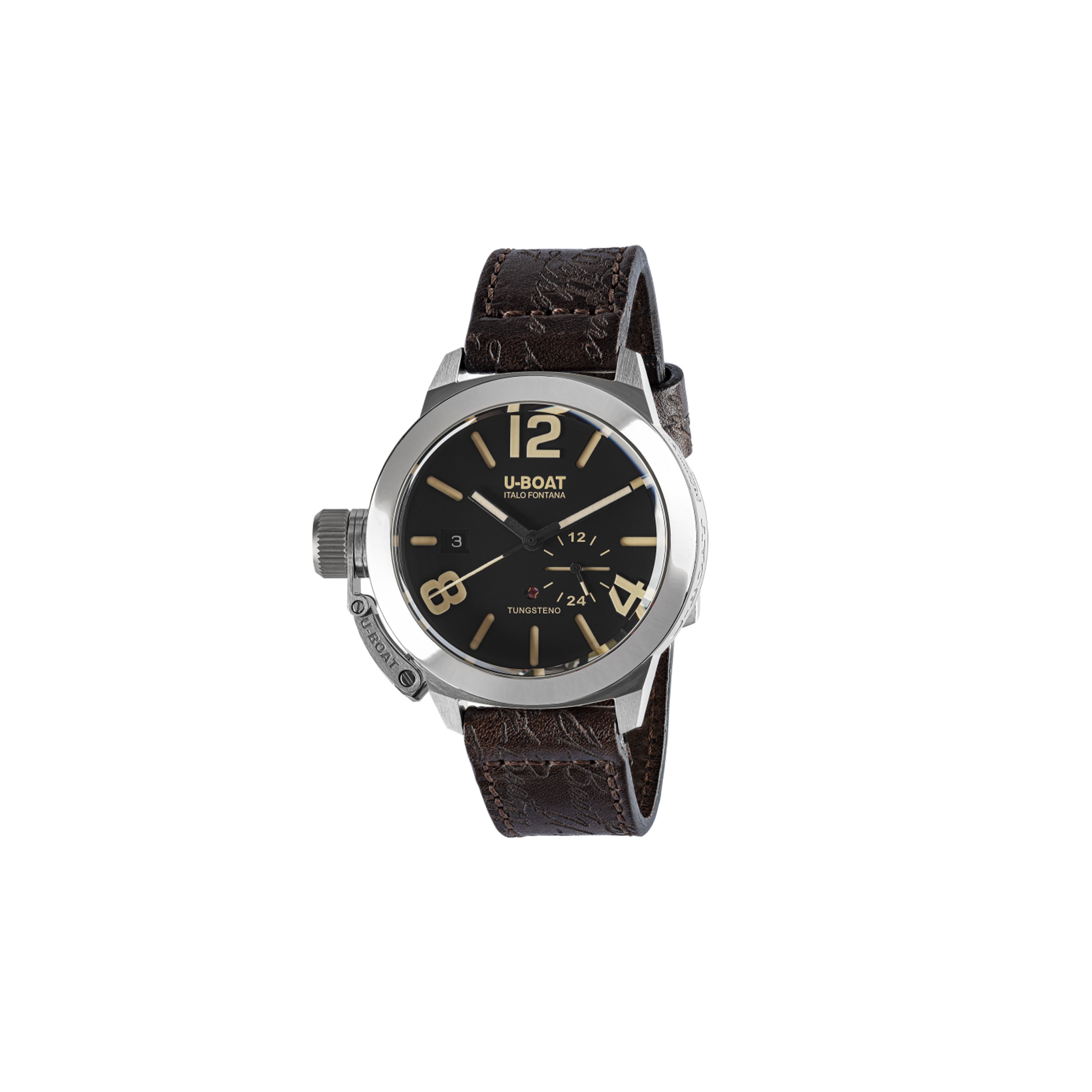 Het U-Boat Capsule horloge, ontworpen door Italo Fontana, combineert een robuuste stalen kast met een zwarte leren band waarin subtiele tekst verwerkt is. Dit horloge straalt een krachtige, stijlvolle uitstraling uit en past perfect bij een verfijnde, eigentijdse look.