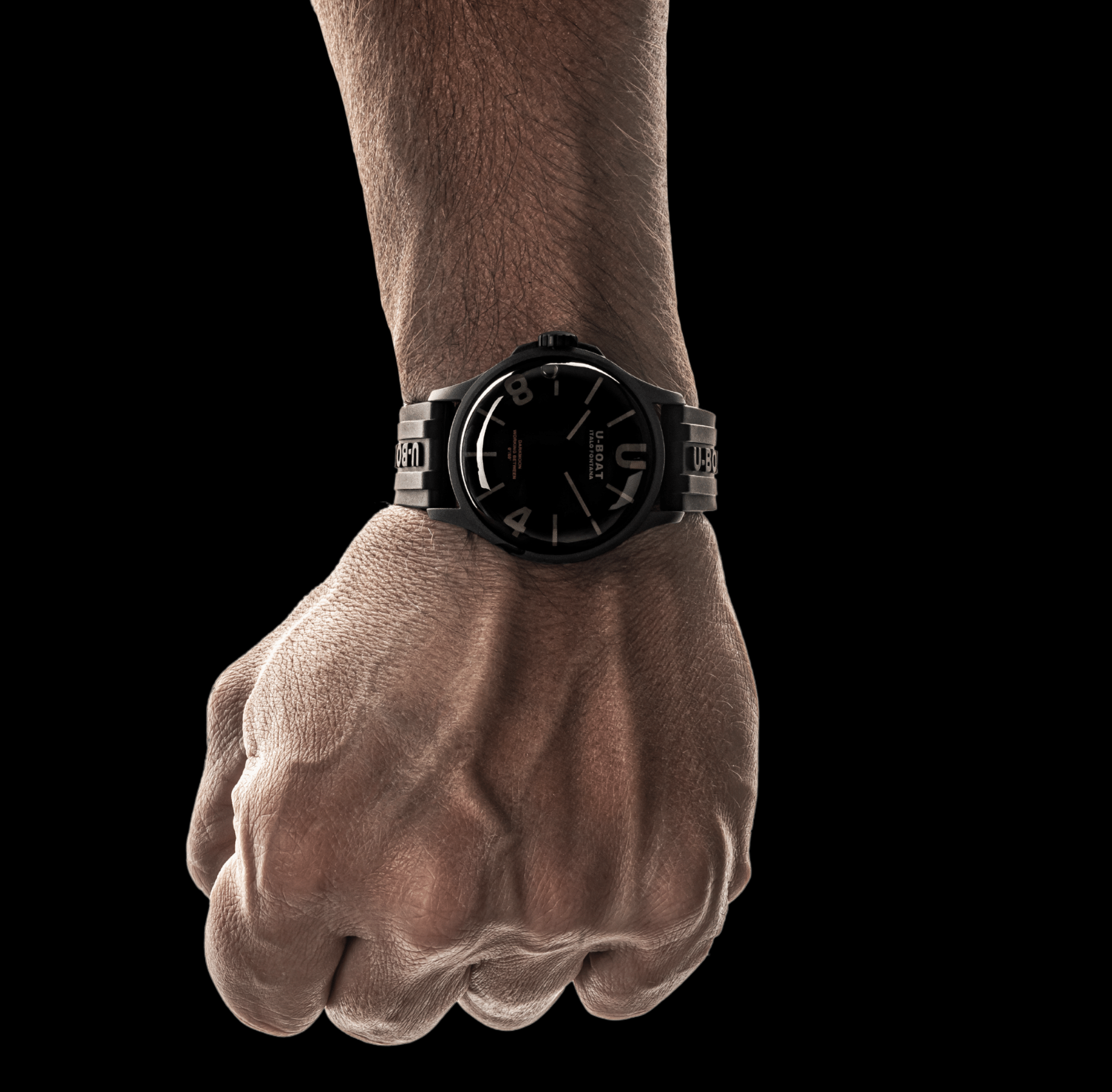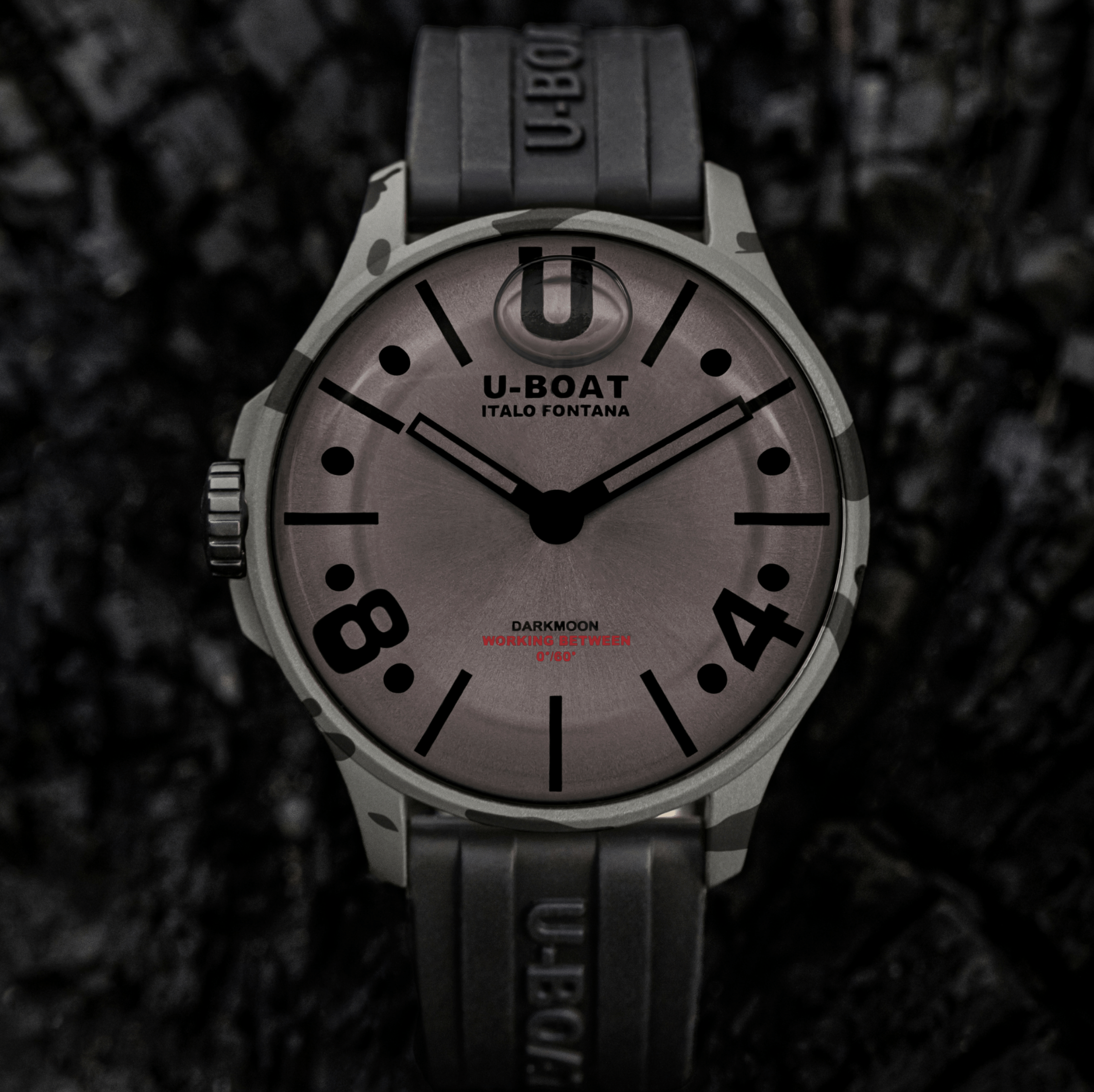 Word verliefd op camouflage! Innovatief “Oil Immersion”-concept in een 40 mm-formaat met een nieuwe gebogen wijzerplaat. Camouflagepatroon met een speciale verf op de stalen kast, behandeld met zwarte PVD, in harmonie met een grijze wijzerplaat.